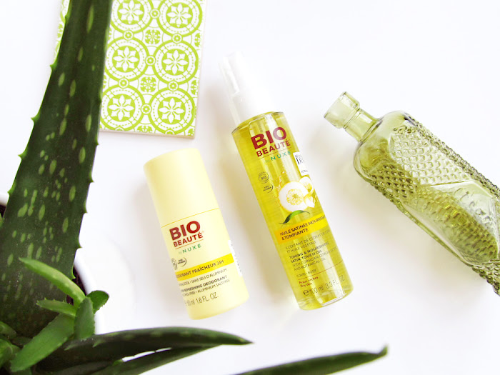 Who doesn't want to be fresh like a lemon in summer? Nuxe outdid themselves again, as their organic Bio Beaute line got freshly squeezed products. Nuxe Toning & Nourishing Satin-touch Oil (17,50€ for 100ml, pharmacies worldwide) applies like a dream, as it's satiny dry on the touch and smells like a lemon-vanilla sorbet. Yum! Definitely my kind of scent, sweet but slightly sour like lemons. It should hydrate, nourish and tone your body with verbena extract from Corsica. Bio sesame oil gives satin touch and it's also good for your body and soul in Ayurveda (yes, I'm slightly broading my horizons). This dry oil doesn't leave greasy film and it's filled with vitamin E. It already won a prize from Vorte Beauty magazine, which is always a good sign. Nuxe 24hr Refreshing Deodorant (8,50€ for 50ml, pharmacies worldwide) has the same lemony-vanilla scent with a touch of herbs (I see sage, rosemary and verbena high on ingredient's list). It's in a roll-on form, which is not my favourite as I have to wait with my clothing. I could easily detect the scent of the deodorant all day, which is another good sign in natural deodorant department. It's not the best at protecting but it does minimise odor through the day. Which is understandable, as it's paraben, aluminium salt and alcohol free. Only thumbs up for now.